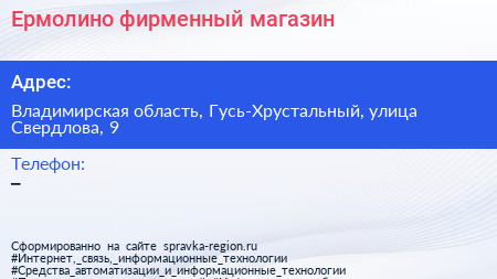 Ермолино, фирменный магазин по адресу Владимирская область, Гусь-Хрустальный, улица Свердлова, 9 в дальнейшем Организация, размещена в следующих категориях: