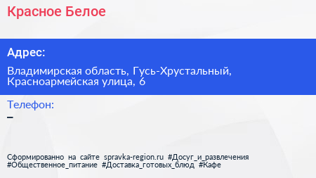 Красное & Белое по адресу Владимирская область, Гусь-Хрустальный, Красноармейская улица, 6 в дальнейшем Организация, размещена в следующих категориях: