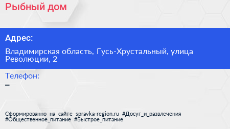 Рыбный дом по адресу Владимирская область, Гусь-Хрустальный, улица Революции, 2 в дальнейшем Организация, размещена в следующих категориях: