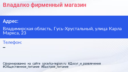 Владалко, фирменный магазин по адресу Владимирская область, Гусь-Хрустальный, улица Карла Маркса, 23 в дальнейшем Организация, размещена в следующих категориях: