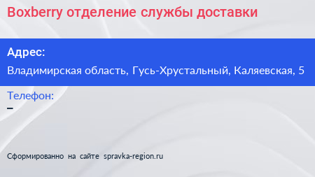 Boxberry, отделение службы доставки по адресу Владимирская область, Гусь-Хрустальный, Каляевская, 5 в дальнейшем Организация, размещена в следующих категориях: