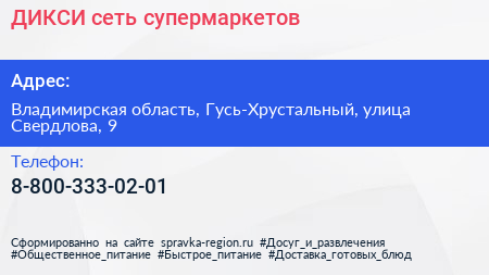ДИКСИ, сеть супермаркетов по адресу Владимирская область, Гусь-Хрустальный, улица Свердлова, 9 в дальнейшем Организация, размещена в следующих категориях: