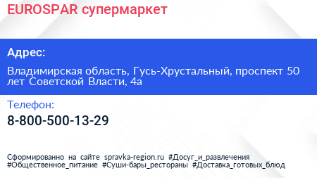 EUROSPAR, супермаркет по адресу Владимирская область, Гусь-Хрустальный, проспект 50 лет Советской Власти, 4а в дальнейшем Организация, размещена в следующих категориях: