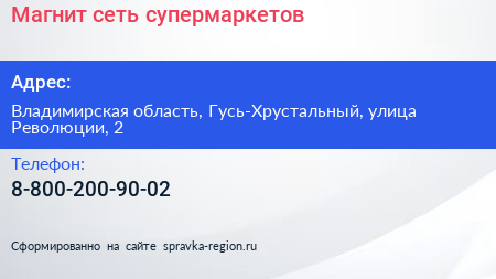 Магнит, сеть супермаркетов по адресу Владимирская область, Гусь-Хрустальный, улица Революции, 2 в дальнейшем Организация, размещена в следующих категориях:
