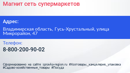 Магнит, сеть супермаркетов по адресу Владимирская область, Гусь-Хрустальный, улица Микрорайон, 47 в дальнейшем Организация, размещена в следующих категориях: