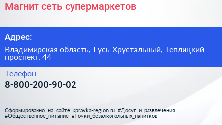 Магнит, сеть супермаркетов по адресу Владимирская область, Гусь-Хрустальный, Теплицкий проспект, 44 в дальнейшем Организация, размещена в следующих категориях:
