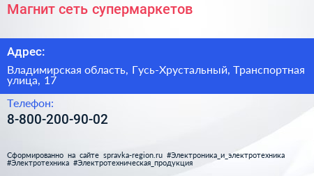 Магнит, сеть супермаркетов по адресу Владимирская область, Гусь-Хрустальный, Транспортная улица, 17 в дальнейшем Организация, размещена в следующих категориях: