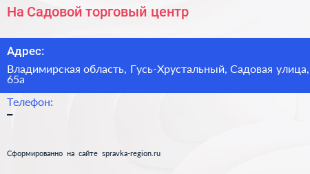 На Садовой, торговый центр по адресу Владимирская область, Гусь-Хрустальный, Садовая улица, 65а в дальнейшем Организация, размещена в следующих категориях: