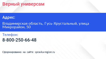 Верный, универсам по адресу Владимирская область, Гусь-Хрустальный, улица Микрорайон, 50 в дальнейшем Организация, размещена в следующих категориях: