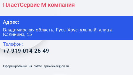 ПластСервис-М, компания по адресу Владимирская область, Гусь-Хрустальный, улица Калинина, 15 в дальнейшем Организация, размещена в следующих категориях: