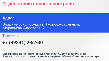 Отдел строительного контроля по адресу Владимирская область, Гусь-Хрустальный, Муравьёва-Апостола, 9 в дальнейшем Организация, размещена в следующих категориях: