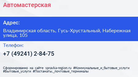 Автомастерская по адресу Владимирская область, Гусь-Хрустальный, Набережная улица, 105 в дальнейшем Организация, размещена в следующих категориях: