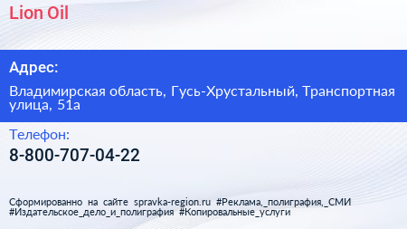 Lion Oil по адресу Владимирская область, Гусь-Хрустальный, Транспортная улица, 51а в дальнейшем Организация, размещена в следующих категориях: