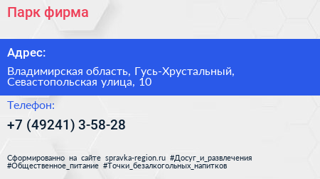 Парк, фирма по адресу Владимирская область, Гусь-Хрустальный, Севастопольская улица, 10 в дальнейшем Организация, размещена в следующих категориях: