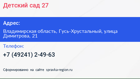 Детский сад №27 по адресу Владимирская область, Гусь-Хрустальный, улица Димитрова, 21 в дальнейшем Организация, размещена в следующих категориях: