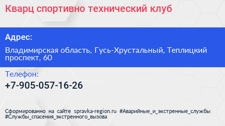 Кварц, спортивно-технический клуб по адресу Владимирская область, Гусь-Хрустальный, Теплицкий проспект, 60 в дальнейшем Организация, размещена в следующих категориях: