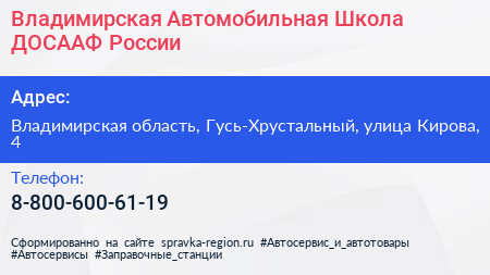Владимирская Автомобильная Школа ДОСААФ России по адресу Владимирская область, Гусь-Хрустальный, улица Кирова, 4 в дальнейшем Организация, размещена в следующих категориях: