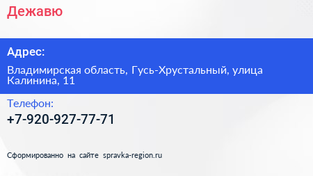 Дежавю по адресу Владимирская область, Гусь-Хрустальный, улица Калинина, 11 в дальнейшем Организация, размещена в следующих категориях: