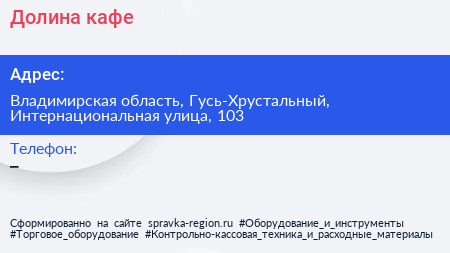 Долина, кафе по адресу Владимирская область, Гусь-Хрустальный, Интернациональная улица, 103 в дальнейшем Организация, размещена в следующих категориях: