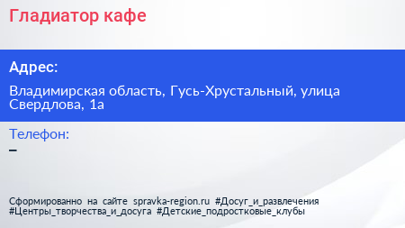 Гладиатор, кафе по адресу Владимирская область, Гусь-Хрустальный, улица Свердлова, 1а в дальнейшем Организация, размещена в следующих категориях: