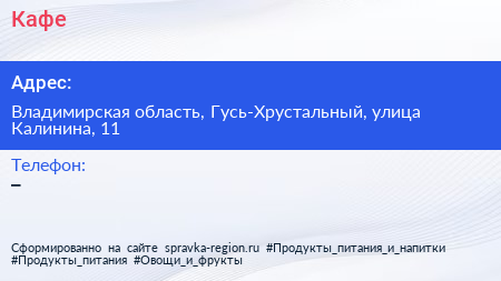 Кафе по адресу Владимирская область, Гусь-Хрустальный, улица Калинина, 11 в дальнейшем Организация, размещена в следующих категориях: