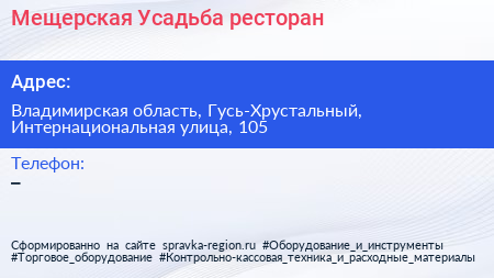 Мещерская Усадьба, ресторан по адресу Владимирская область, Гусь-Хрустальный, Интернациональная улица, 105 в дальнейшем Организация, размещена в следующих категориях: