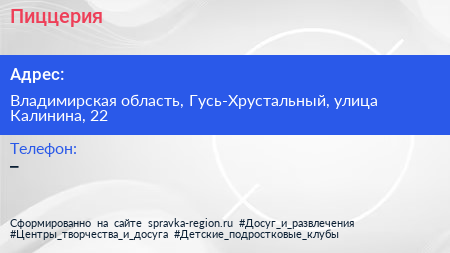 Пиццерия по адресу Владимирская область, Гусь-Хрустальный, улица Калинина, 22 в дальнейшем Организация, размещена в следующих категориях: