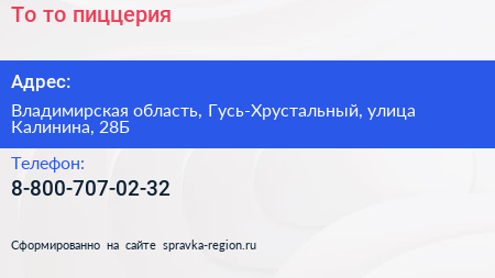 То-то, пиццерия по адресу Владимирская область, Гусь-Хрустальный, улица Калинина, 28Б в дальнейшем Организация, размещена в следующих категориях: