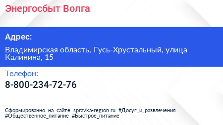 Энергосбыт Волга по адресу Владимирская область, Гусь-Хрустальный, улица Калинина, 15 в дальнейшем Организация, размещена в следующих категориях:
