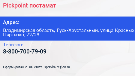 Pickpoint, постамат по адресу Владимирская область, Гусь-Хрустальный, улица Красных Партизан, 72/29 в дальнейшем Организация, размещена в следующих категориях: