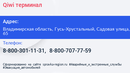 Qiwi, терминал по адресу Владимирская область, Гусь-Хрустальный, Садовая улица, 65 в дальнейшем Организация, размещена в следующих категориях: