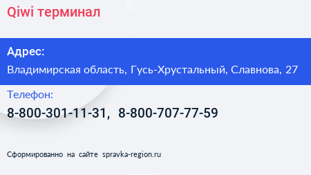 Qiwi, терминал по адресу Владимирская область, Гусь-Хрустальный, Славнова, 27 в дальнейшем Организация, размещена в следующих категориях: