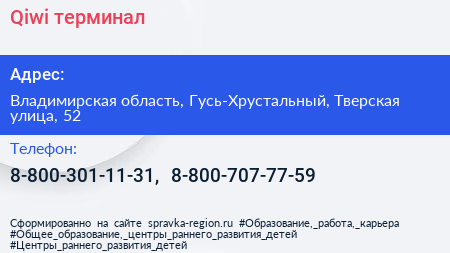 Qiwi, терминал по адресу Владимирская область, Гусь-Хрустальный, Тверская улица, 52 в дальнейшем Организация, размещена в следующих категориях: