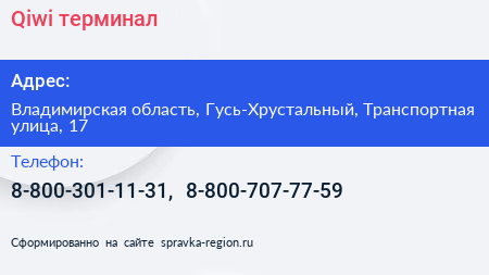Qiwi, терминал по адресу Владимирская область, Гусь-Хрустальный, Транспортная улица, 17 в дальнейшем Организация, размещена в следующих категориях: