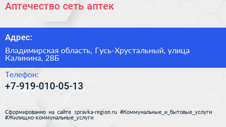 Аптечество, сеть аптек по адресу Владимирская область, Гусь-Хрустальный, улица Калинина, 28Б в дальнейшем Организация, размещена в следующих категориях: