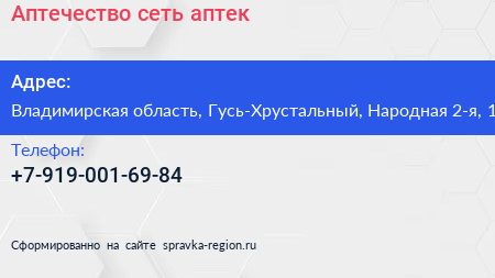 Аптечество, сеть аптек по адресу Владимирская область, Гусь-Хрустальный, Народная 2-я, 1 в дальнейшем Организация, размещена в следующих категориях: