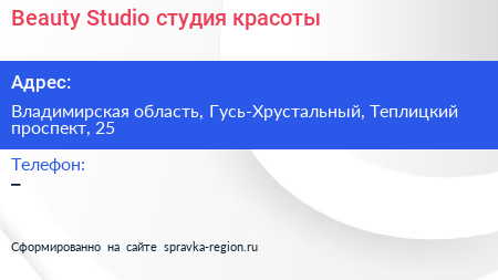 Beauty Studio, студия красоты по адресу Владимирская область, Гусь-Хрустальный, Теплицкий проспект, 25 в дальнейшем Организация, размещена в следующих категориях: