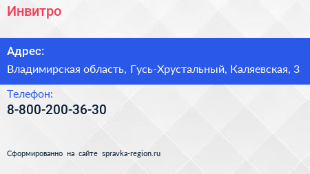 Инвитро по адресу Владимирская область, Гусь-Хрустальный, Каляевская, 3 в дальнейшем Организация, размещена в следующих категориях: