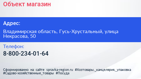 Объект, магазин по адресу Владимирская область, Гусь-Хрустальный, улица Некрасова, 50 в дальнейшем Организация, размещена в следующих категориях: