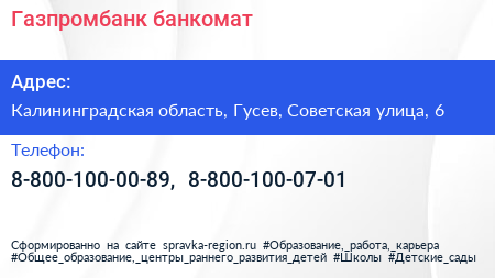 Газпромбанк, банкомат по адресу Калининградская область, Гусев, Советская улица, 6 в дальнейшем Организация, размещена в следующих категориях:
