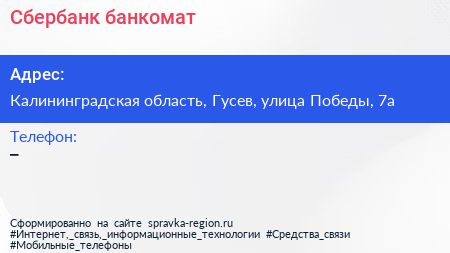 Сбербанк, банкомат по адресу Калининградская область, Гусев, улица Победы, 7а в дальнейшем Организация, размещена в следующих категориях: