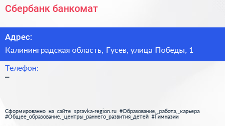 Сбербанк, банкомат по адресу Калининградская область, Гусев, улица Победы, 1 в дальнейшем Организация, размещена в следующих категориях: