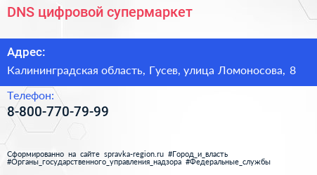 DNS, цифровой супермаркет по адресу Калининградская область, Гусев, улица Ломоносова, 8 в дальнейшем Организация, размещена в следующих категориях: