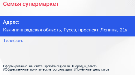 Семья, супермаркет по адресу Калининградская область, Гусев, проспект Ленина, 21а в дальнейшем Организация, размещена в следующих категориях: