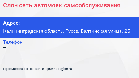 Слон, сеть автомоек самообслуживания по адресу Калининградская область, Гусев, Балтийская улица, 2Б в дальнейшем Организация, размещена в следующих категориях: