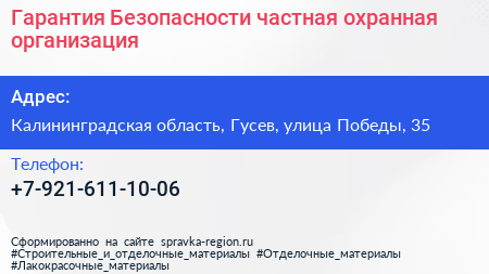 Гарантия Безопасности, частная охранная организация по адресу Калининградская область, Гусев, улица Победы, 35 в дальнейшем Организация, размещена в следующих категориях: