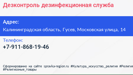 Дезконтроль, дезинфекционная служба по адресу Калининградская область, Гусев, Московская улица, 14 в дальнейшем Организация, размещена в следующих категориях: