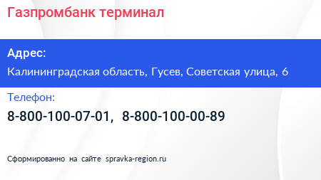 Газпромбанк, терминал по адресу Калининградская область, Гусев, Советская улица, 6 в дальнейшем Организация, размещена в следующих категориях: