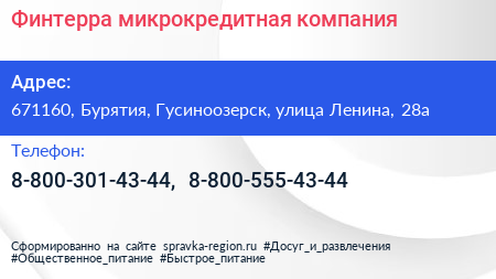 Финтерра, микрокредитная компания по адресу 671160, Бурятия, Гусиноозерск, улица Ленина, 28а в дальнейшем Организация, размещена в следующих категориях: