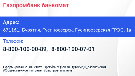 Газпромбанк, банкомат по адресу 671161, Бурятия, Гусиноозерск, Гусиноозерская ГРЭС, 1а в дальнейшем Организация, размещена в следующих категориях: